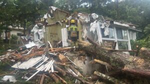 Durante um período de chuva intensa e ventos fortes, um pinus de grande porte atingiu uma casa de madeira de aproximadamente 80 metros quadrados, provocando a destruição total da sala, cozinha e varandas, incluindo telhado e paredes. Outras três árvores de grande porte também caíram nas proximidades do imóvel.