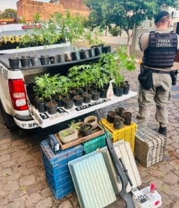 Ao todo, foram apreendidos 50 pés de maconha, 15 porções de maconha (já fracionadas), uma balança de precisão, quatro telefones celulares, dois potes com sementes de maconha, uma espingarda de pressão alterada para disparar munição de calibre 22, bem como cartuchos de munição de espingarda e revólver já deflagrados.