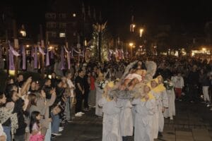 Com um elenco de 400 pessoas, a Procissão dos Passos proporcionou um dos momentos mais marcantes da programação da ChocoPáscoa Gramado – Gramado Aleluia na noite de Sexta-feira Santa (18). Ao som de matracas, tambores e outros instrumentos de percussão da Banda da Escola Senador Salgado Filho, o cortejo iluminou a avenida Borges de Medeiros com tochas. Os turíbulos (incensários) deram um visual ainda mais impactante ao espetáculo. Nem mesmo a chuva, que caiu pouco antes da procissão, impediu que um grande público lotasse as calçadas ao longo da Borges.