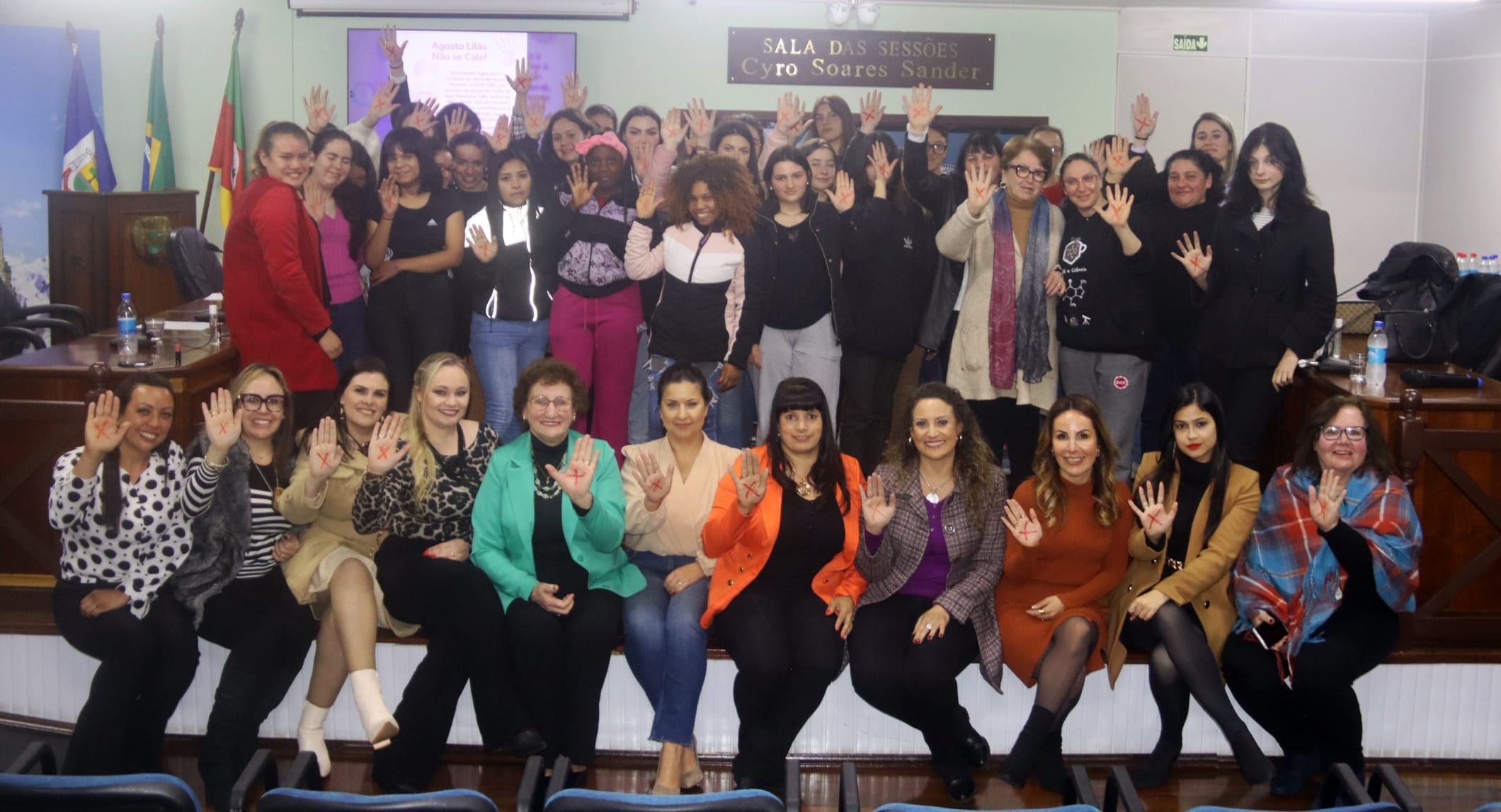 Na noite desta quarta-feira, 30, o bate-papo “Agosto Lilás – Não se Cale”, promovido pelas vereadoras Carmen Lúcia Seibt de Moraes, Carla Reis e Andresa da Conceição atraiu um grande público até a Câmara Municipal de Canela. O encontro foi realizado para conscientizar convidados e a comunidade em geral sobre a urgência de pôr fim à violência contra mulheres. Estiveram prestigiando o evento o Prefeito em Exercício, Jefferson de Oliveira, e os vereadores Felipe Caputo, Roberto Danany, José Vellinho Pinto e Jerônimo Terra Rolim.
