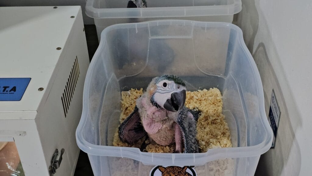 Segundo Lima, as ararinhas são alimentadas a cada duas horas ao nascerem. “Os recém-nascidos recebem alimento conforme esvazia o papo. Já os filhotes que nasceram primeiro, estão com aproximadamente 45 dias e, agora, recebem alimentação três vezes ao dia. São 180 gramas de papinha especial por vez”, conta.