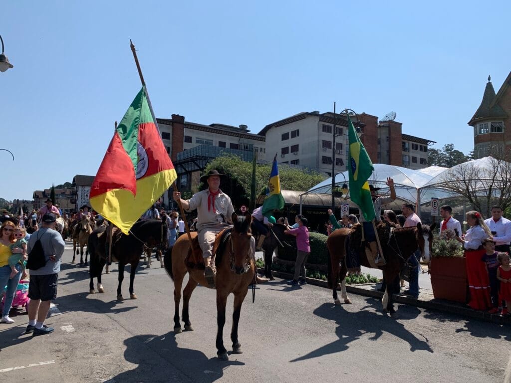 Nesta quarta-feira (20), com a bandeira do Rio Grande do Sul em meio mastro, em sinal de respeito às vítimas das cidades atingidas pelas fortes chuvas no início deste mês, cavaleiros, cavaleiras e participantes de invernadas artísticas do CTG Manotaço e de outras entidades tradicionalistas do município percorreram o Centro de Gramado para buscar a chama Crioula no Centro Municipal de Cultura, junto ao Lago Joaquina Rita Bier. O símbolo foi levado ao CTG Manotaço e extinto à meia-noite, marcando o fim dos Festejos Farroupilhas de 2023.