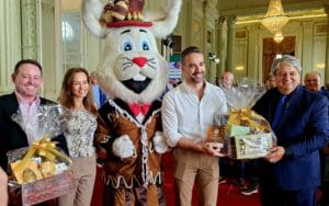 O governador do Rio Grande do Sul, Eduardo Leite, e o secretário estadual do Turismo, Ronaldo Santini, receberam a comitiva de Gramado nesta segunda-feira, dia 24, para a entrega do convite para a ChocoPáscoa Gramado, que ocorre de 28 de março a 21 de abril. O prefeito de Gramado, Nestor Tissot, e a presidente da Gramadotur, Rosa Helena Volk, foram acompanhadas do coelho Pascoalino, mascote do evento, até o Palácio Piratini, em Porto Alegre. Além do convite oficial, as lideranças estaduais foram presenteadas com cestas de Páscoa preparadas pela Associação dos Chocolateiros de Gramado (Achoco).