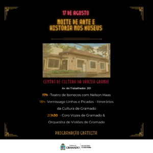 Dia Nacional do Patrimônio Histórico, comemorado em 17 de agosto, será marcado por uma ação muito especial em Gramado: a primeira edição da Noite de Arte e História nos Museus. Nesta data, cinco espaços patrimoniais do município vão receber atrações artísticas e culturais até às 22 horas da noite.