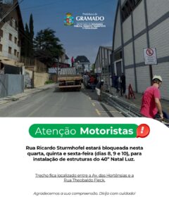 A Secretaria de Segurança Pública, Transporte e Fiscalização informa que a Rua Ricardo Sturmhofel (fundos da Prefeitura), estará bloqueada para o fluxo de veículos nesta quarta, quinta e sexta-feira (dias 8, 9 e 10), para instalação de estruturas do 40º Natal Luz de Gramado.